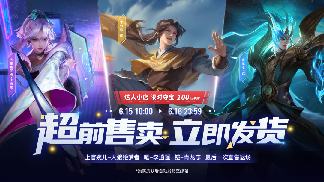 对了,喜欢李逍遥、青龙志、天狼绘梦者这几款皮肤的小伙伴,别忘了在怪客的皮肤小店入手哦! 可以比别人提前2天玩到,还能参与额外抽奖!