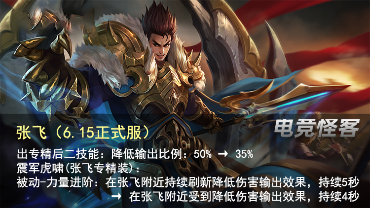 现在改为 只有在张飞附近,才会受到降低输出的效果。 而且降低输出的比例也从 50%下降到了35% ,太惨了。