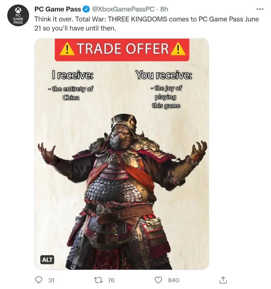 微软PC Game Pass(PC版XGP)今日(6.16)官宣:《全面战争:三国》即将在 6月21日 加入PGP订阅服务!届时订阅用户 可以 无需购买游戏直接开玩。