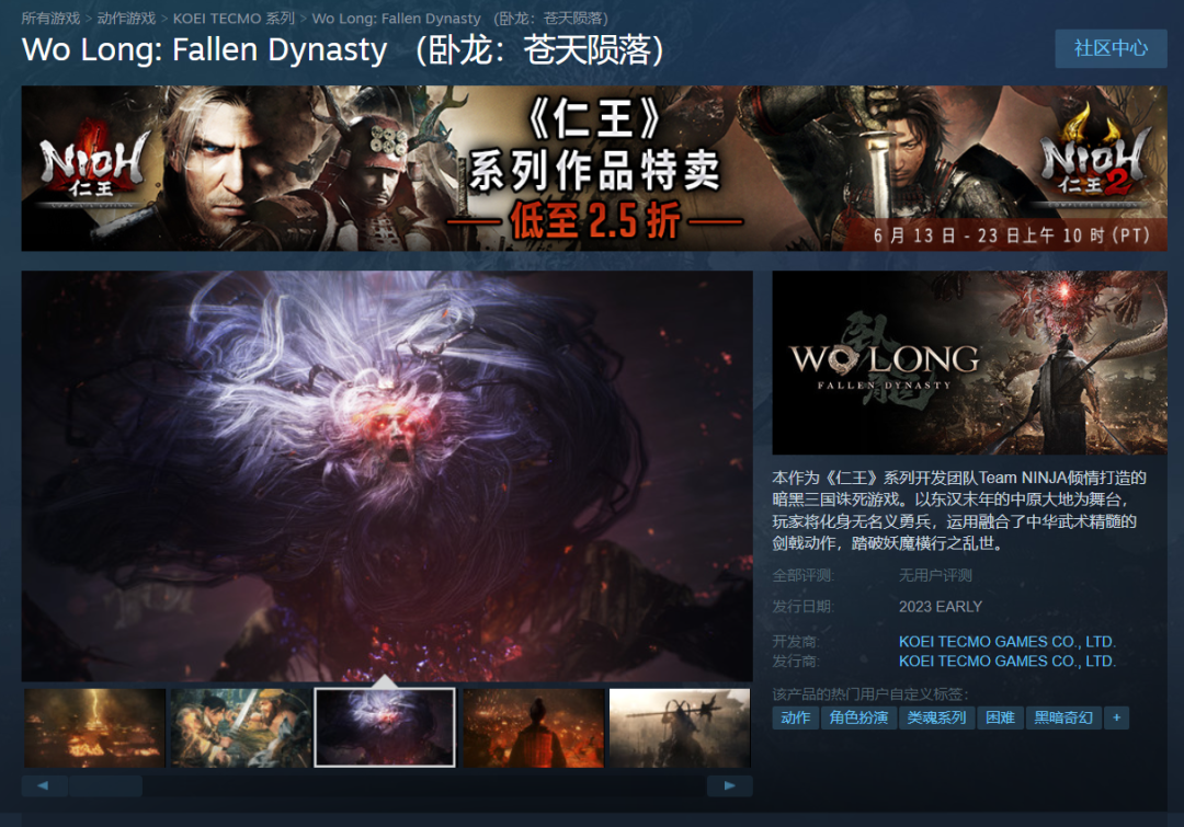 《仁王》系列开发团队忍者组新 动作游戏《卧龙:苍天殒落》正式上线Steam商店,宣布将于2023年早期发售。游戏支持简体中文 。