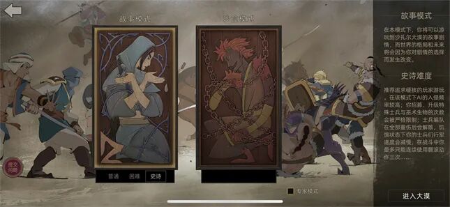 本作设置了“故事模式”与“沙盒模式”两种玩法。顾名思义在故事模式中我们将深入这个大漠世界,亲身体验一段壮阔的故事,游戏中每次行动都将切实改变自己与 NPC 的关系乃至世界格局,沙盒模式则侧重于自由探索世界以及与强大的敌人斗智斗勇。