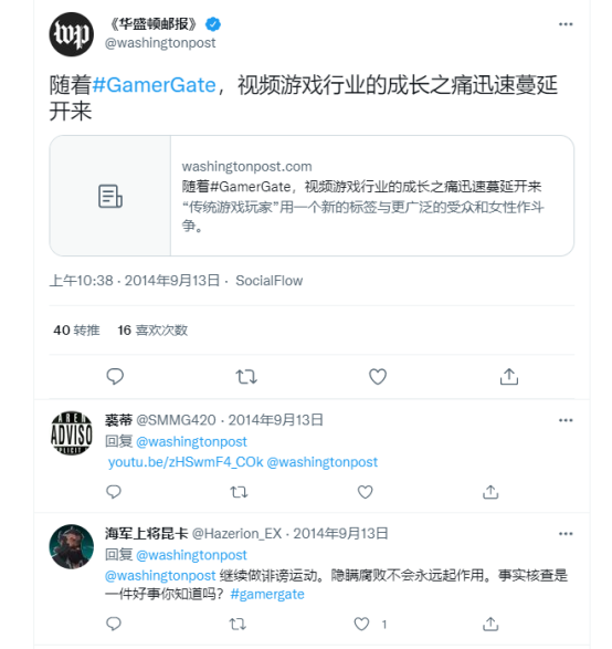 然而在媒体拱火下,双方内部那些激进的观点被不断放大了,一些本就无关性别的事件被塑造成了两个性别的对立,曾经轰动一时的“玩家门(gamers gate)”就是一个例子。
