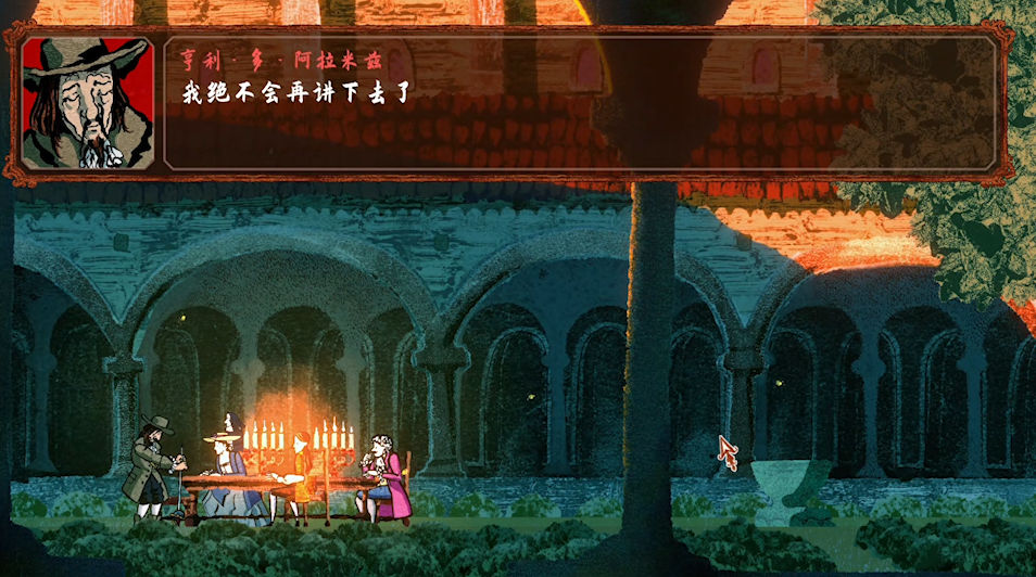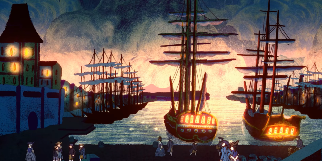 1:游戏的很多大场景画幅稳定,画面有种类似壁画的布局效果,很好地将人物,场景景观,道具的布局舒展地展示给玩家,信息量充足;再结合版画厚实叠加的笔触,古朴的颜色搭配,都给予玩家非常重的时代感体验 ,光看画面就能感受得到那种18世纪的感觉。