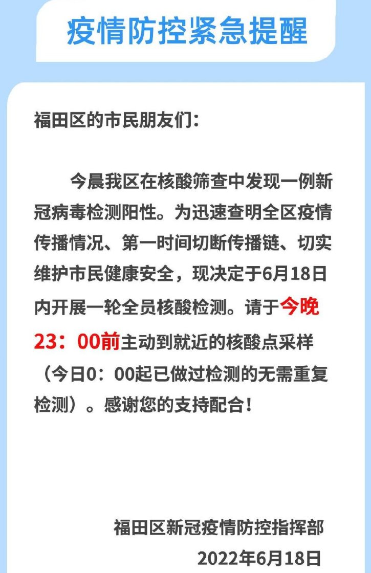 据广东新闻联播微博消息,6月18日清晨,深圳福田区在核酸筛查中发现一例新冠病毒检测阳性。