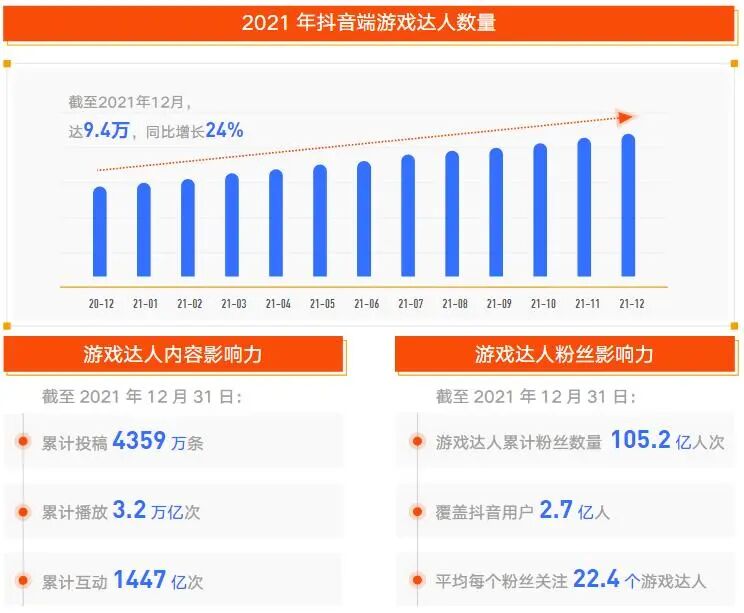 既然是直播营销,主播达人的选择自然至关重要。《白皮书》指出,过去一年抖音上的游戏创作者和游戏内容累计播放分别达到3082万和1220亿次,同比增长分别达到99%和66%。游戏主播的数量也越来越多,到2021年底达9.4万人同比增长24%,截至2022年3月同比增长仍达到21.2%。