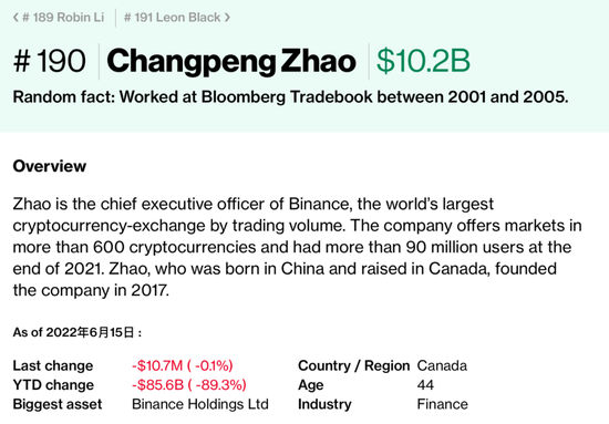 截至6月15日,赵长鹏身家又再缩水了超1000万美元,身家今年至今已经暴跌89.3%,蒸发了856亿美元(约5800亿人民币)。