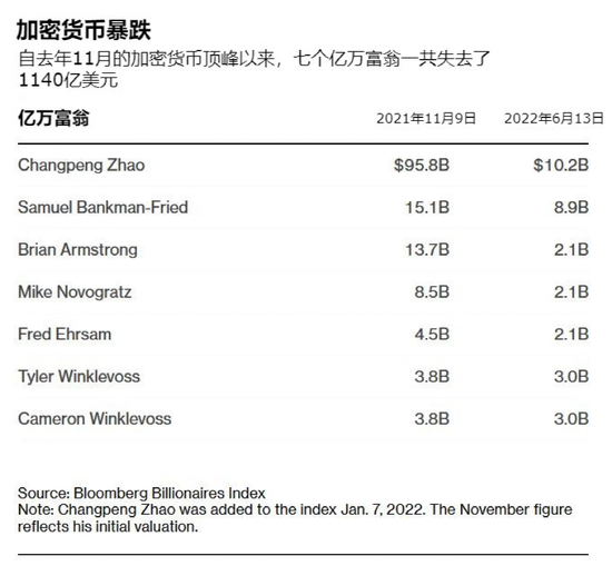 根据彭博亿万富翁指数,从11月9日比特币历史高点6.9万美元至今徘徊于2.1万美元附近,与加密货币有关的七位亿万富翁总共损失了1140亿美元。