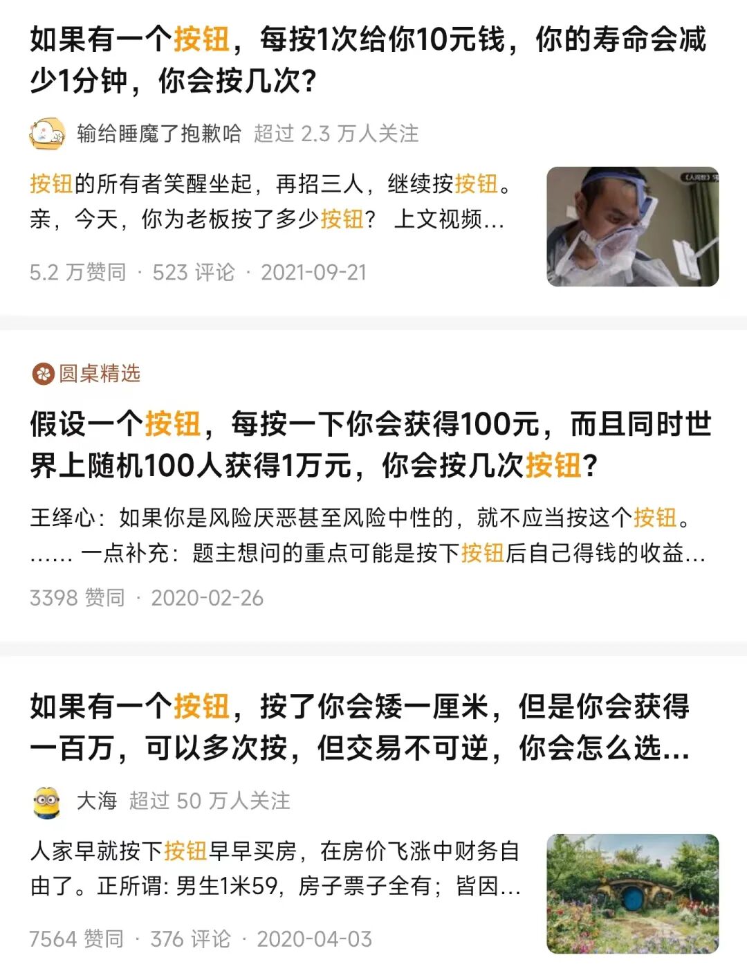 “按一下按钮得到N元钱,但是会有一个副作用”基本上按这个格式去提个问题,就可以围观人在美国,刚下飞机的网友们对着一个并不存在的按钮撕得你死我活,并开心地收割一波流量。