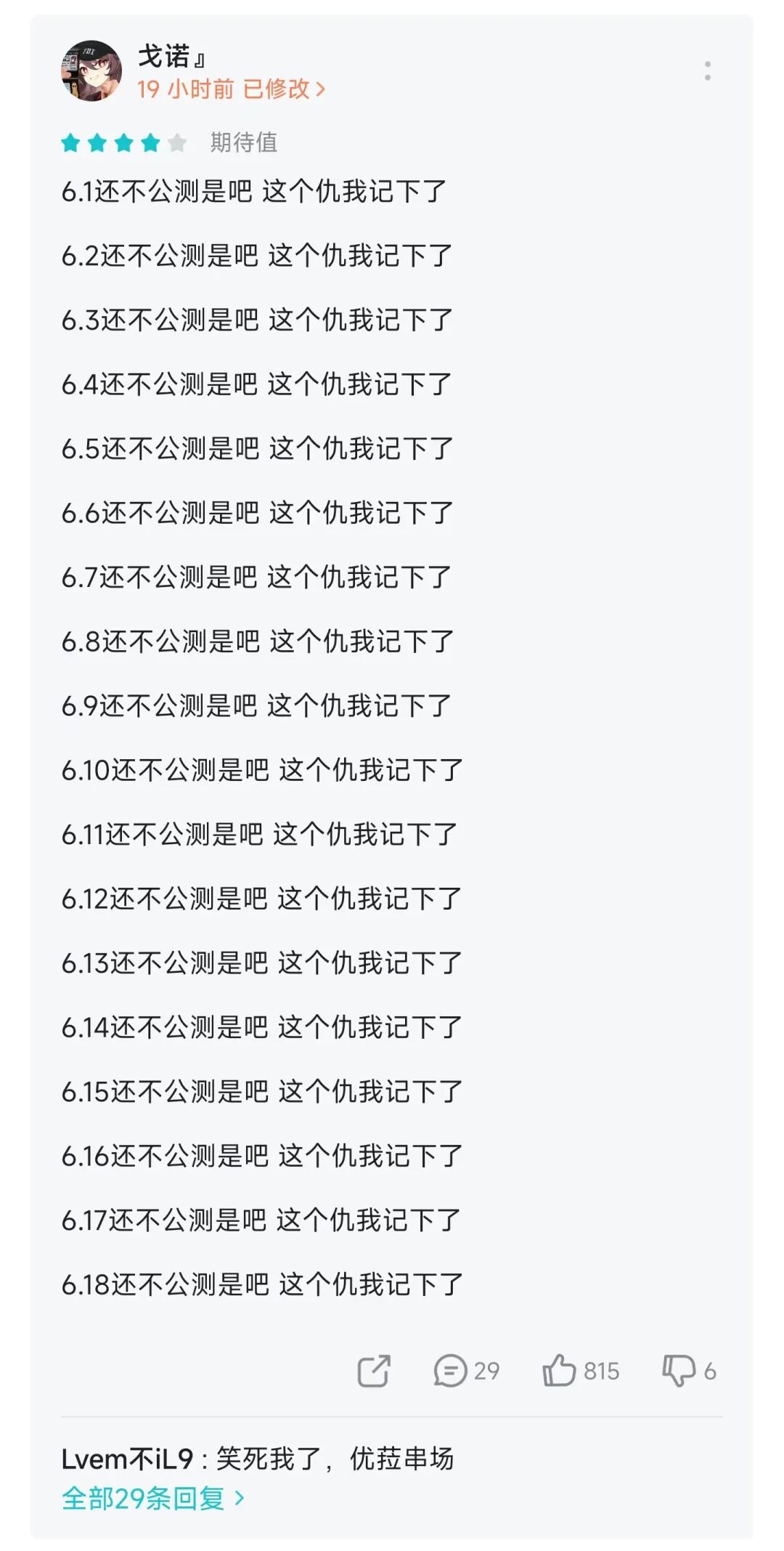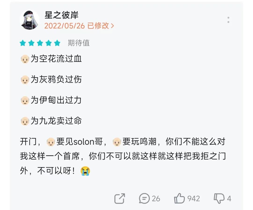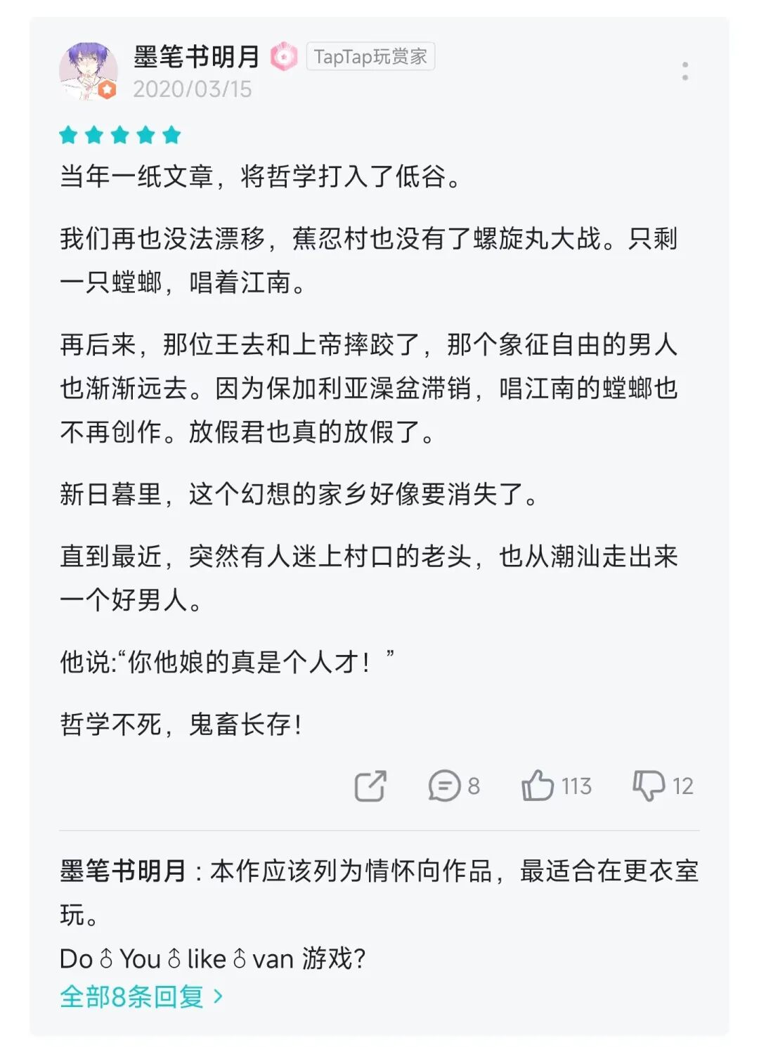 在 TapTap 催游戏上线的花样一直是很多的,比如在评价里写“祠堂体”小作文:
