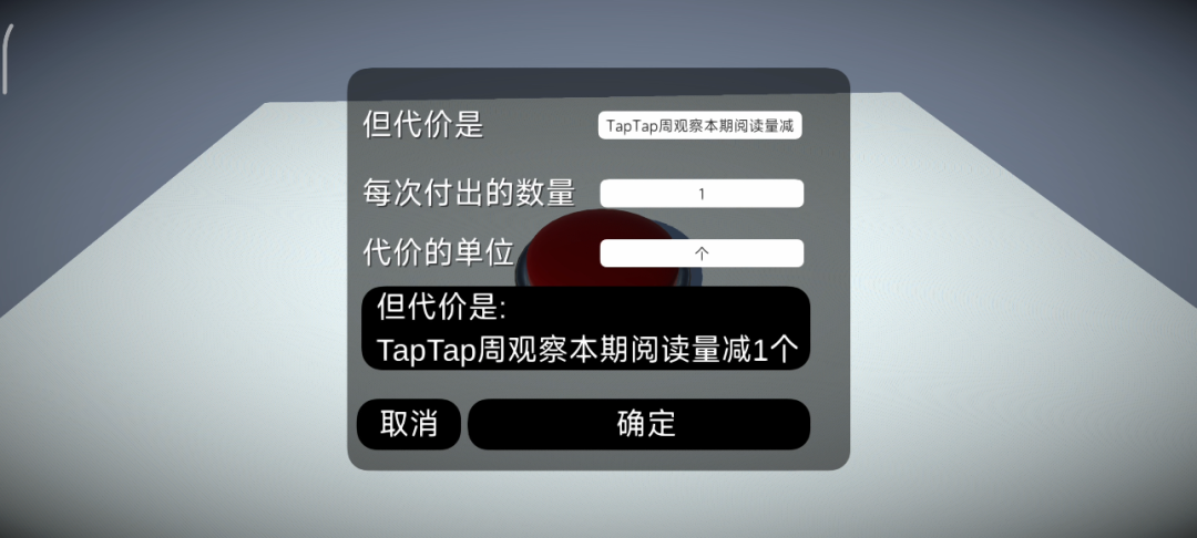 当然如果你觉得自带的这些代价不够好玩的话,游戏也支持自定义代价,设置好代价的文字描述,付出的数量和代价的单位就可以愉快地按起来了。比如“按一次按钮得到一万元,但是TapTap周观察本期阅读量减1”。