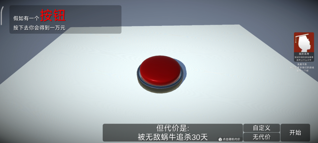 游戏玩法也简单到令人发指,按下按钮的收益是得到一万元,代价则可以随机选择,游戏内置了很多知乎经典设定,比如按一次按钮变矮一厘米、按一次按钮被无敌蜗牛追杀30天、你最恨的人会获得10万元之类的。