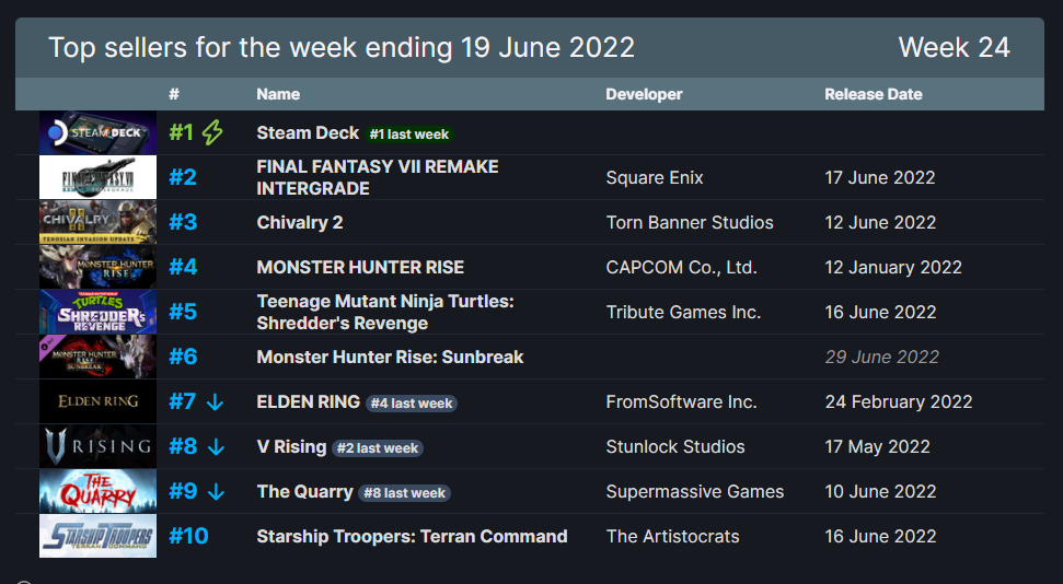 新一周的steam周销榜出来了(时间截止至6月19日)。排在第一名的依旧是V社的掌机。 《最终幻想7:重制过渡版》排在第二。