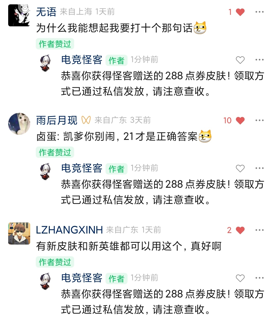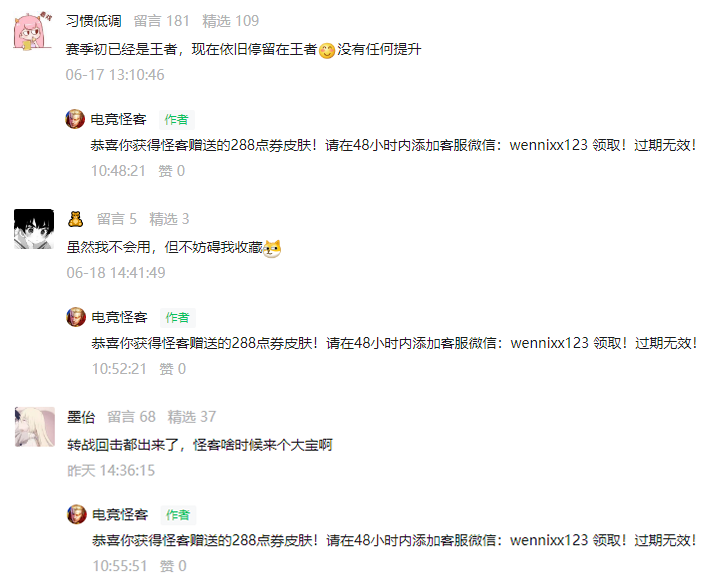 恭喜这两位小伙伴获得怪客赠送的皮肤基金奖励, 请留意你们的微信后台消息(没收到的可以主动给公众号发消息联系怪客),怪客会联系你们添加客服微信领取皮肤基金!