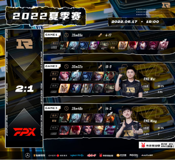 众所周知RNG在MSI夺冠后 没多久就与BLG置换了上路选手,面对即将到来的夏季赛,即使LPL官方贴心的将RNG首战尽量延迟,能用来休息、训练、磨合的时间依然略显仓促,但RNG再次顶住了压力,让1追2战胜FPX逆境反打,虽然状态稍显慢热但已经在比赛中慢慢亮出锋芒,Wei的打野节奏掌控、关键时刻抢龙救场、Gala随时拉满的输出,小虎刁钻的开团时机、小明攻守兼备进退有度、新人呼吸哥Breathe也稳稳顶住线压,即时支援为其他线路抓住发育时间,并在参团时拥有出色发挥,这支队伍在短短的时间里已经将顶级强队的状态重铸雏形,相信随着比赛的深入,队伍状态手感回归会有更出色的表现。