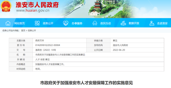 6月20日,淮安市发布《关于加强淮安市人才安居保障工作的实施意见》。