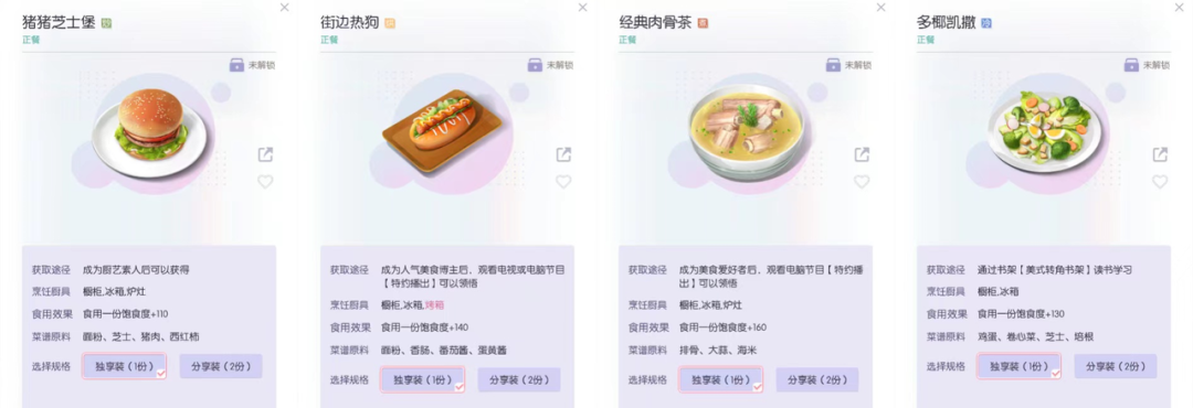 围绕烹饪,游戏内也引入了美食系统,在“衣”以外,它保证了“食”的可能性。根据玩家不同的等级,游戏内设有对应食谱,从基础果汁,到煎蛋,再到汉堡,玩家甚至能够享受到烹饪的乐趣。