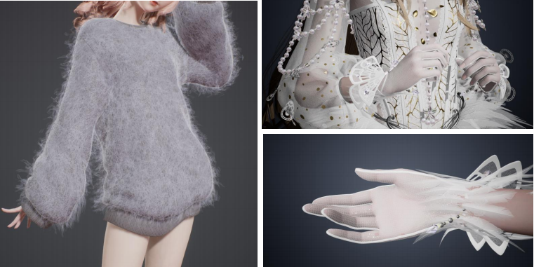 此外,为了让服饰更好地呈现纱质叠穿的效果,团队还尝试了多种半透明渲染方式,以优化最终效果。