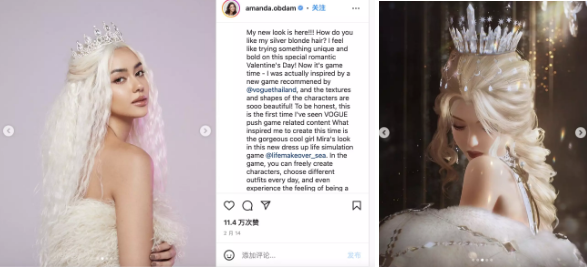 东南亚地区,泰国超模Amanda Obdam还以游戏主题装扮为灵感分享妆容,这条发布在ins上的图文获得超11万点赞。