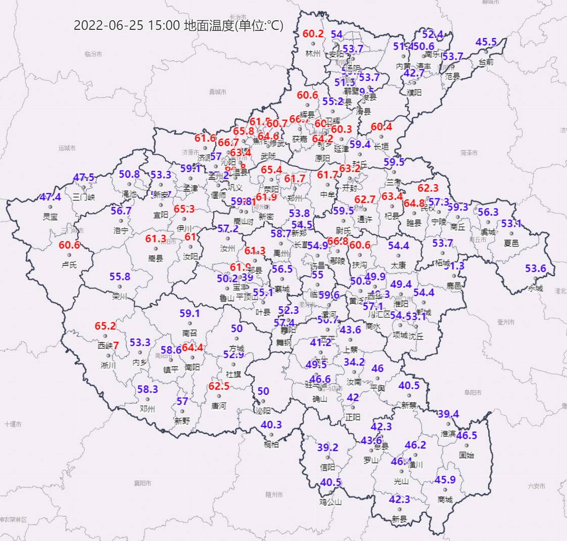 25日15时地面温度监测结果显示,河南省大部地面温度在50℃以上,部分县市在60℃以上,鄢陵最高66.8℃,郑州市61.7℃。