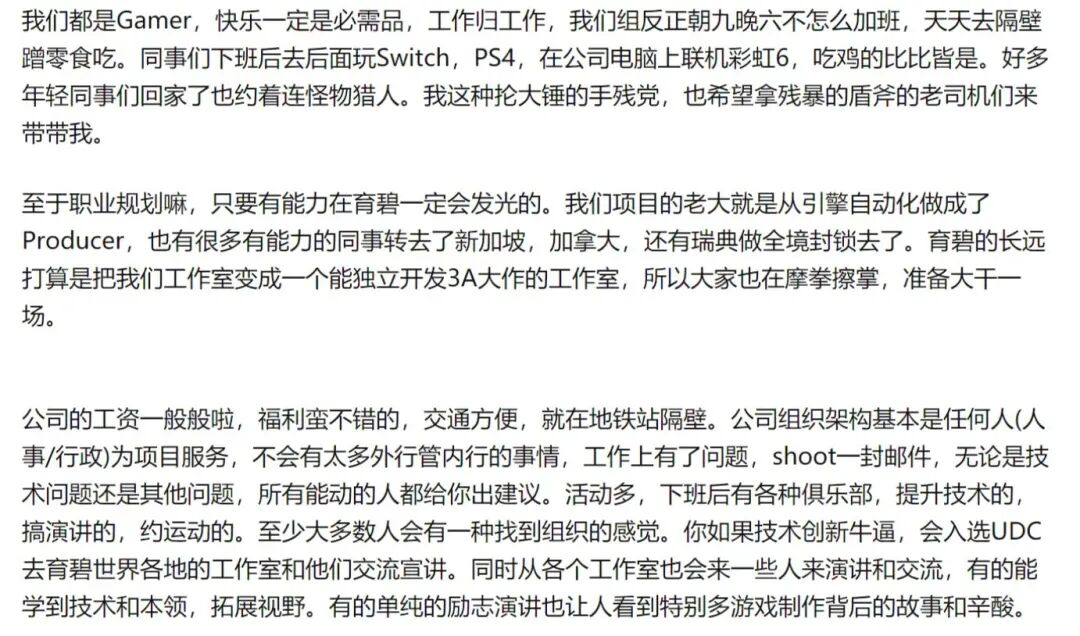 可能相比国内头部大厂,育碧开出的薪资并不算特别有优势,不过成熟的游戏工业化流程、长期研发积累下来的工具和经验都让育碧成为了“学技术”的好去处。联合开发的模式也使项目立项后活下来的可能性更高,相对稳定、不996、年假多、晋升潜力大也让不少人调侃育碧适合游戏人“养老”。