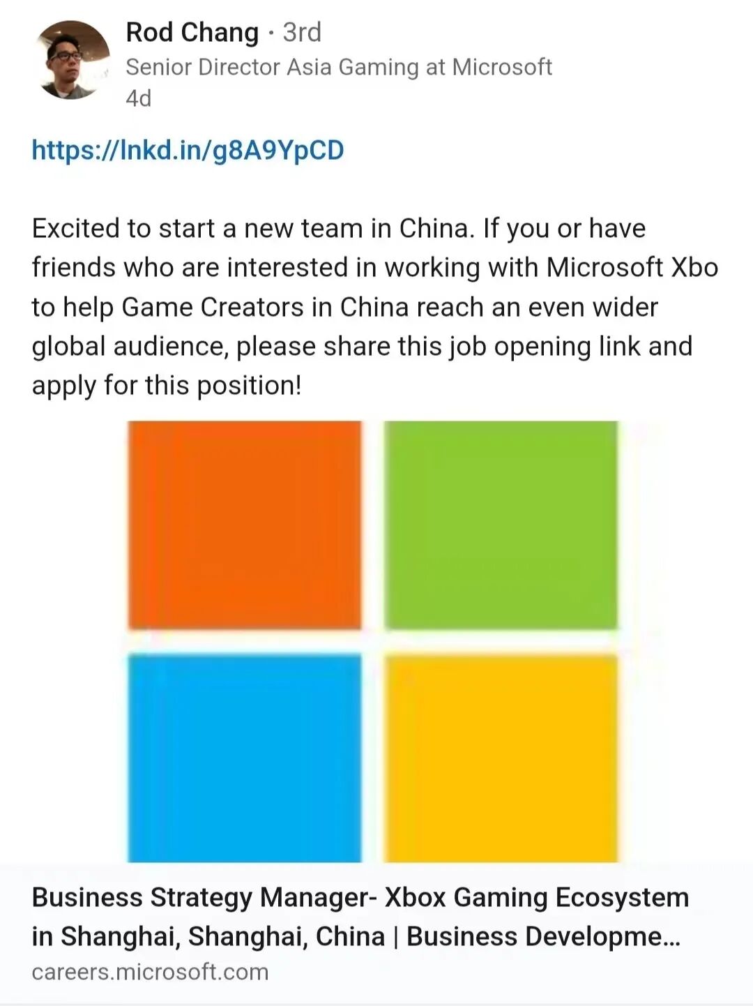 此外, 微软 全球游戏合作与发展部门亚洲区负责人Rod Chang也在今年2月份发布了关于搭建上海团队的消息。