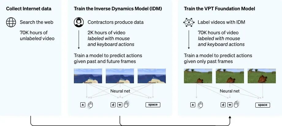 互联网包含大量可供我们学习的公开视频,例如游戏玩家演示游戏玩法,《我的世界》玩家建造一个错综复杂的房子。然而这些视频只提供了事情发生的记录,而不是确切的实现方式,即没有说明鼠标移动和按键的确切顺序。