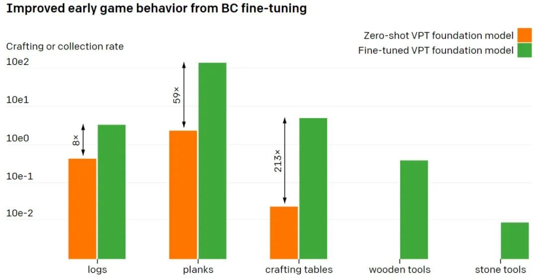 那么,VPT 基础模型 如何微调到下游数据集呢 ?OpenAI 让人类玩家在最新版《我的世界》中玩了 10 分钟,并用基本的材料建造房子。OpenAI 希望这能增强基础模型执行早期游戏技能的能力。结果表明,基础模型在可靠执行早期游戏技能方面有了巨大进步,而且微调后的模型还掌握了制作石器等新技能。
