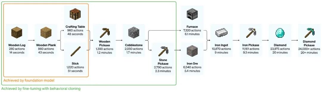 微调之后,OpenAI 训练的模型还可以学习制作挖矿工具,熟练的人类玩家在 20 分钟内可以完成这个任务(24000 次操作)。OpenAI 的模型使用按键和鼠标移动控制人机界面,这使得该模型非常通用,这向通用计算机使用智能体迈出了一步。