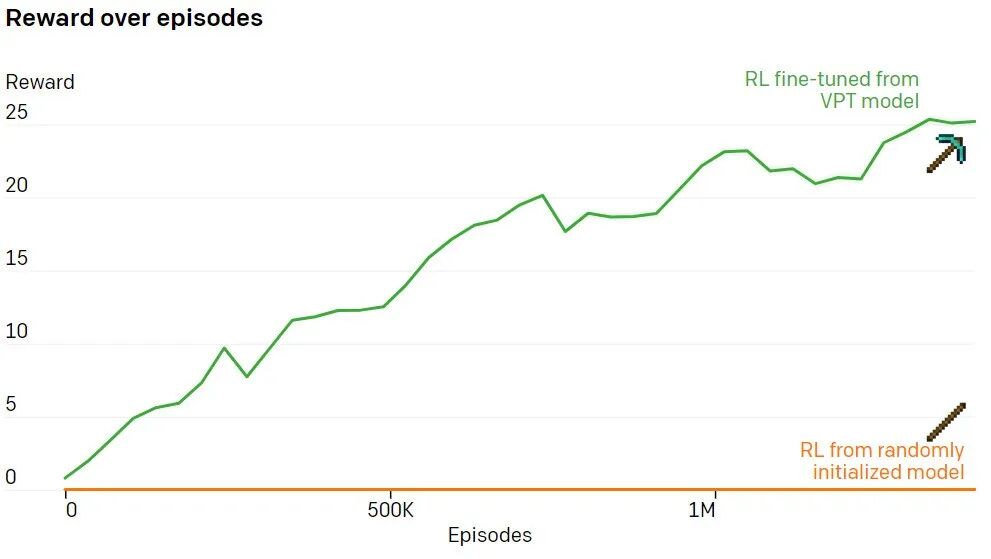 当指定的奖励函数足够好时,强化学习便能够成为一种强大的方法去激发更高的,甚至是超人类的表现。VPT 模型和 RL 搭配更好,因为模仿人类行为可能比采取随机行动更有帮助。该研究设置了一些模型挑战任务,即收集钻石鹤嘴锄,这是在《我的世界》中前所未有的能力。
