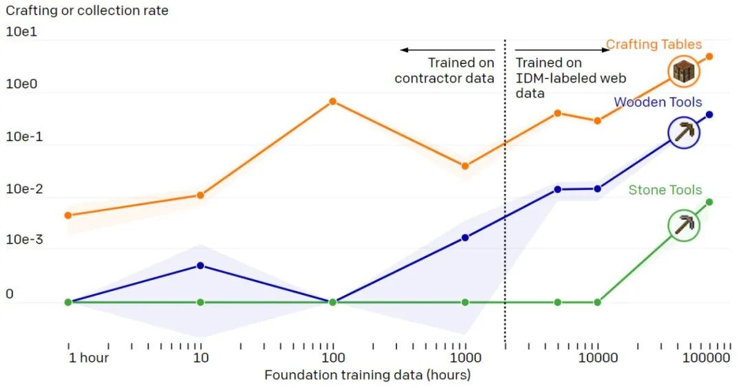 此外,该模型还可以执行人类在游戏中经常执行的其他复杂技能,例如游泳、狩猎动物、食用食物以及一些《我的世界》专用技能。