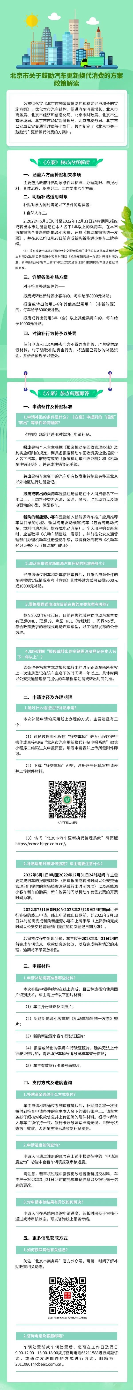 市商务局在解读《方案》时表示,报废是指个人车主根据《报废机动车回收管理办法》及其实施细则的规定,到具备报废机动车回收资质企业报废个人名下汽车,取得有效的《报废机动车回收证明》和《机动车注销证明》,并完成注销登记手续。转出是指车主名下的汽车所有权发生转移且转移至北京以外地区进行注册登记。报废或转出的乘用车是指注册登记在个人消费者名下一年以上,且燃料种类为汽油、柴油、燃气、混合动力以及纯电驱动的小型、微型客车。新购的新能源小客车是指纳入新能源汽车推广应用推荐车型目录的小型、微型纯电驱动载客汽车。