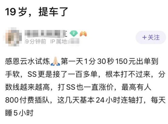 更有甚者,在早期花钱请代练打到了还算不错的成绩,而在各位连续几天的疯狂内卷过后,这个成绩早已不够看,想要坐稳SS的评价,要么自己努努力自力更生,要么乖乖掏钱继续为代练充值。