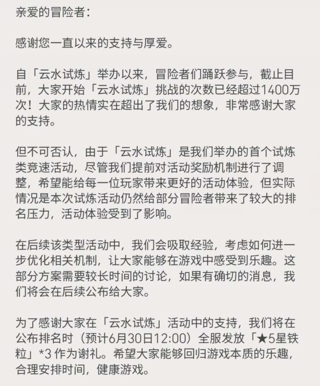 到了这一步,国服的运营也发现有点不太对劲了。根据他们在活动结束两天前发布的公告来看,国服挑战云水试炼的总次数在短短一周之内超过了1400万次,被吓傻了的官方赶紧全服发放奖励,希望大家能“回归游戏本质的乐趣”,