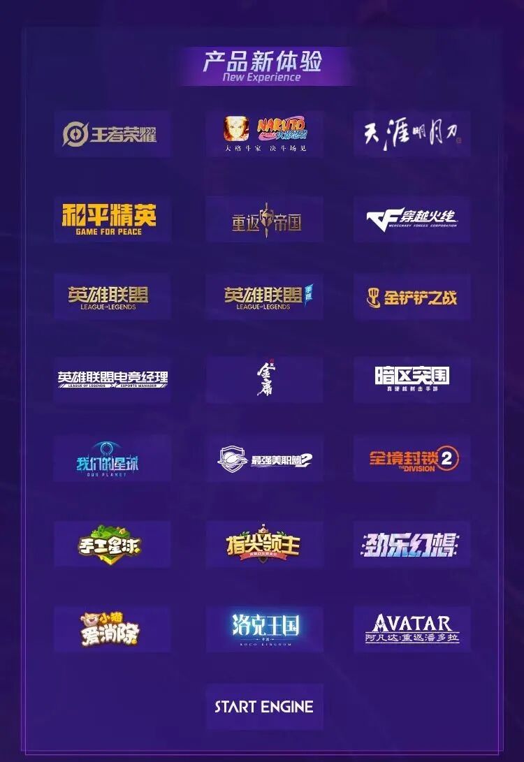 《王者荣耀》、《火影忍者》、《天涯明月刀OL》、《天涯明月刀手游》、《和平精英》、《重返帝国》、《穿越火线》、穿越火线:高清竞技大区、《穿越火线:枪战王者》《英雄联盟》、《英雄联盟手游》、《金铲铲之战》、《英雄联盟电竞经理》、《代号:致金庸》、《暗区突围》、《我们的星球》、《最强美职篮2》、《全境封锁2》、《手工星球》、《指尖领主》、《劲乐幻想》、《小猫爱消除》、《洛克王国手游》、《阿凡达:重返潘多拉》、《EVOLUTION·进化》