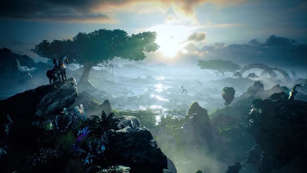 开阔的远景视角下,骑着一匹重铠马的阿凡达在悬崖边眺望远方,映入眼帘的是潘多拉星球倒映着炽热阳光的独特湿地生态。