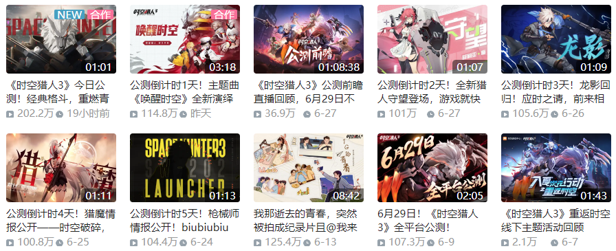 其次bilibili游戏对《时空猎人3》的宣传精心设计了大量高品质物料。从2020年就开始曝光,到今年开始集中宣传,《时空猎人3》大量高品质角色PV充分展示了角色特点和实战效果,电影预告片质感的公测CG超过200W播放,情怀纪录片亦短时间突破百万播放量,涨粉速度更是惊人。
