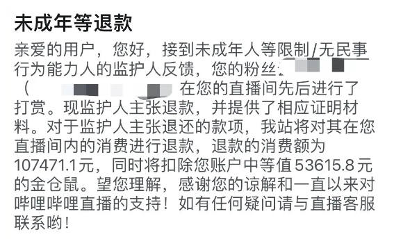 当天,大大小小几十位虚拟主播同时收到了一份强制的退款通知:根据通知中的说明来看,这是一场由未成年人打赏消费引发的集体退款。涉及此事的中小型主播损失的金额之庞大,相当于连续工作数月的收入。