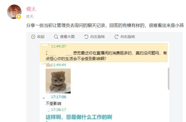 本次退款事件的当事人之一“蝶太”正是如此。此前在收到一笔大额打赏后,他第一时间找到了自己的金主,委婉地打探对方的身份,一方面是关心对方的经济情况,另一方面也是害怕自己拿到的这笔打赏今后是否会有风险。