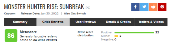 今日,《怪物猎人崛起:曙光》M站媒体评分解禁,目前M站媒体均分86分,24家媒体中,22家媒体给出好评,2家中评,0差评。