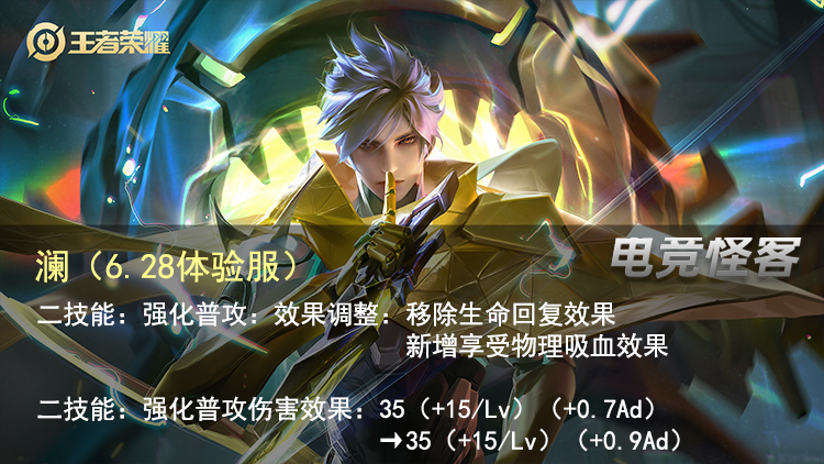 移除了二技能强化普攻附带的 生命回复 效果,改成了 二技能的强化普攻可以吸血 。这一次的改动虽然很小,但对澜而言其实也算是一次小重塑了。
