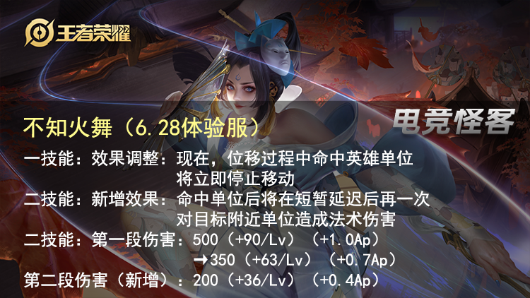 1、一技能现在在位移过程中,命中敌方英雄就会停止。也就是 不知火舞改动后想要用前排做跳板去切后排,可能就会有点困难。