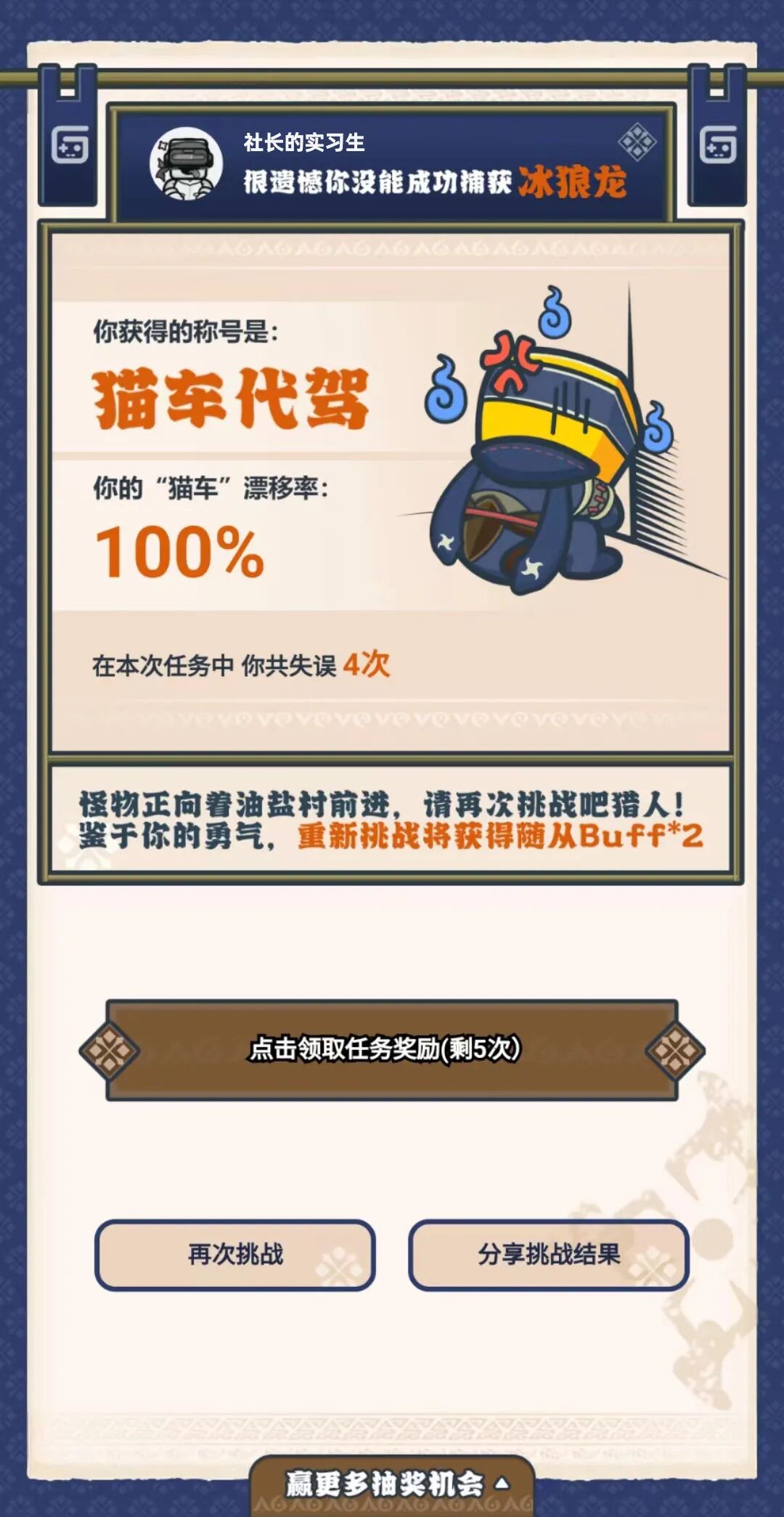 为了不剧透太多,剩下的“难关”还是由各位猎人自行体会吧。别忘了, 想要增加抽奖次数 ,就去“任务列表”查看一下待完成的任务 。难度都不高,每完成一项就会增加一次抽奖机会,全部完成任务还会获得App限定猎人徽章一枚!