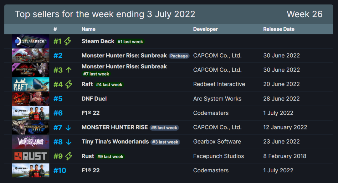 新一周Steam周销榜(时间截止至7月3日)。不出意外的,新发售的《怪物猎人:崛起》的DLC《曙光》会上榜,但是没想到只是第二名的位置,第一名仍然由V社掌机夺得。