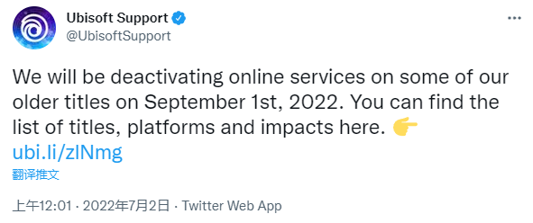 育碧近期在官网发文表示, 将于 今年9 月1日 停止对一些游戏的在线服务支持,同时PC版禁用DLC的下载与访问。他们表示 这样做是 为了集中资源给新作或比较流行的游戏 提供出色的体验。