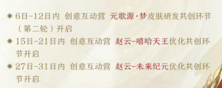 中旬到下旬的这两段时间,则会开启 赵云的两款皮肤:嘻哈天王、未来纪 元的共创环节。预计应该是一些海报或设计细节、局外背景的方案投票。