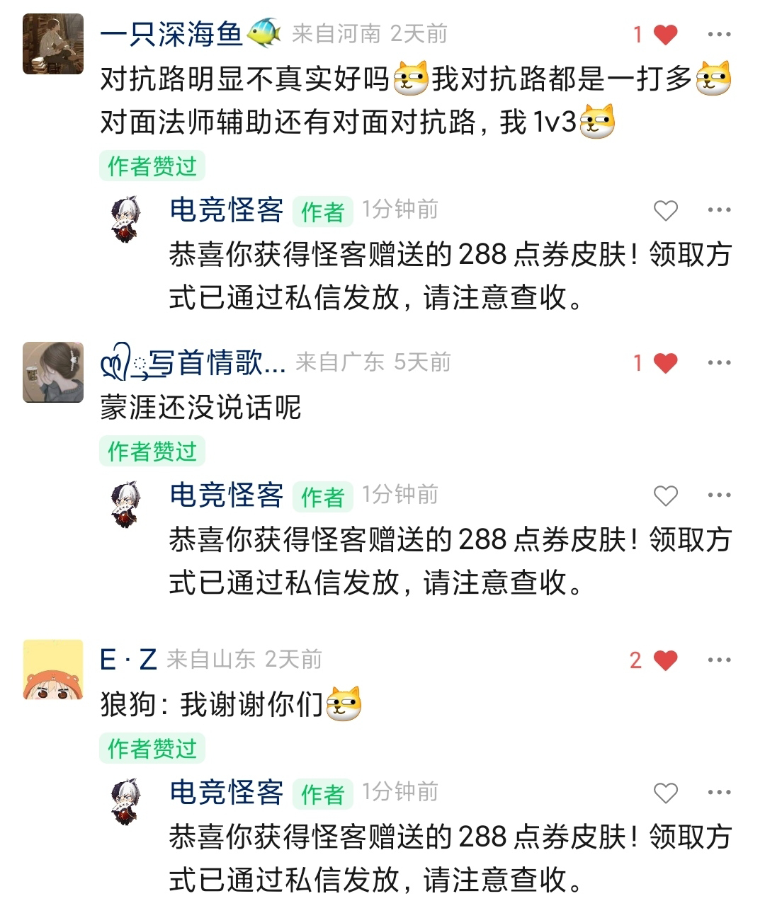 恭喜这两位小伙伴获得怪客赠送的皮肤基金奖励, 请留意你们的微信后台消息(没收到的可以主动给公众号发消息联系怪客),怪客会联系你们添加客服微信领取皮肤基金!