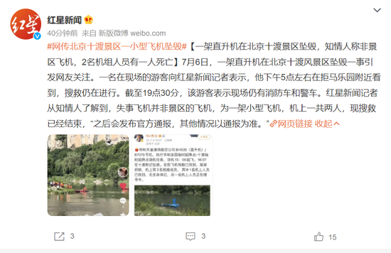 据红星新闻,2名机组人员有一人死亡,一名在现场的游客向记者表示,他下午5点左右在拒马乐园附近看到,搜救仍在进行。截至19点30分,该游客表示现场仍有消防车和警车。