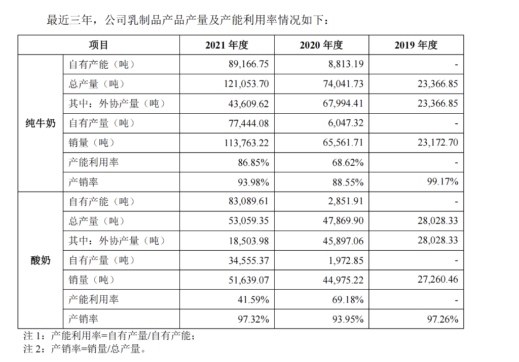 直至2021年,认养一头牛的山东生产基地开始投入使用以后,其才减少对外协厂商的依赖——同期认养一头牛的纯牛奶自有产量和外协产量分别为7.74万吨、4.36万吨。
