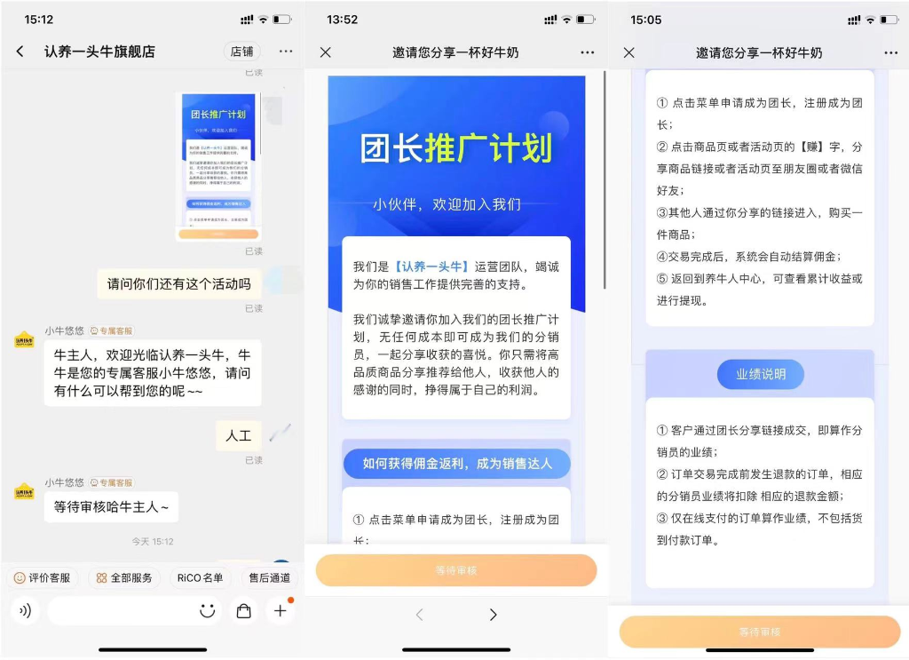 信风(ID:TradeWind01)注意到,认养一头牛的“团长推广计划”和分销员推广的方式相似,该计划称注册成为团长后的用户即可成为分销员,团长只需将商品分享推荐给他人,当客户通过团长提供的链接下单时,这一销售额即可成为团长的业绩。信风(ID:TradeWind01)扫码“团长推广计划”并填写相关信息后,该链接显示“等待审核”。