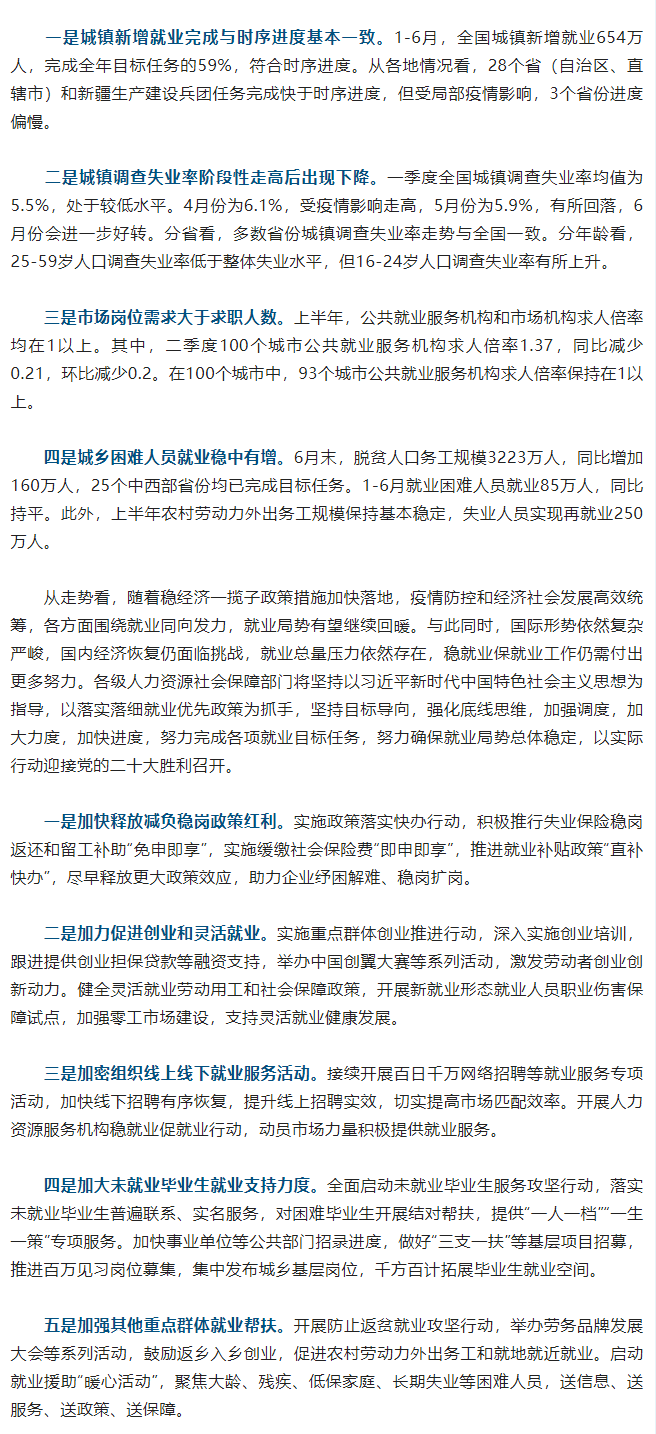 1—6月全国城镇新增就业654万人 完成全年目标任务的59%